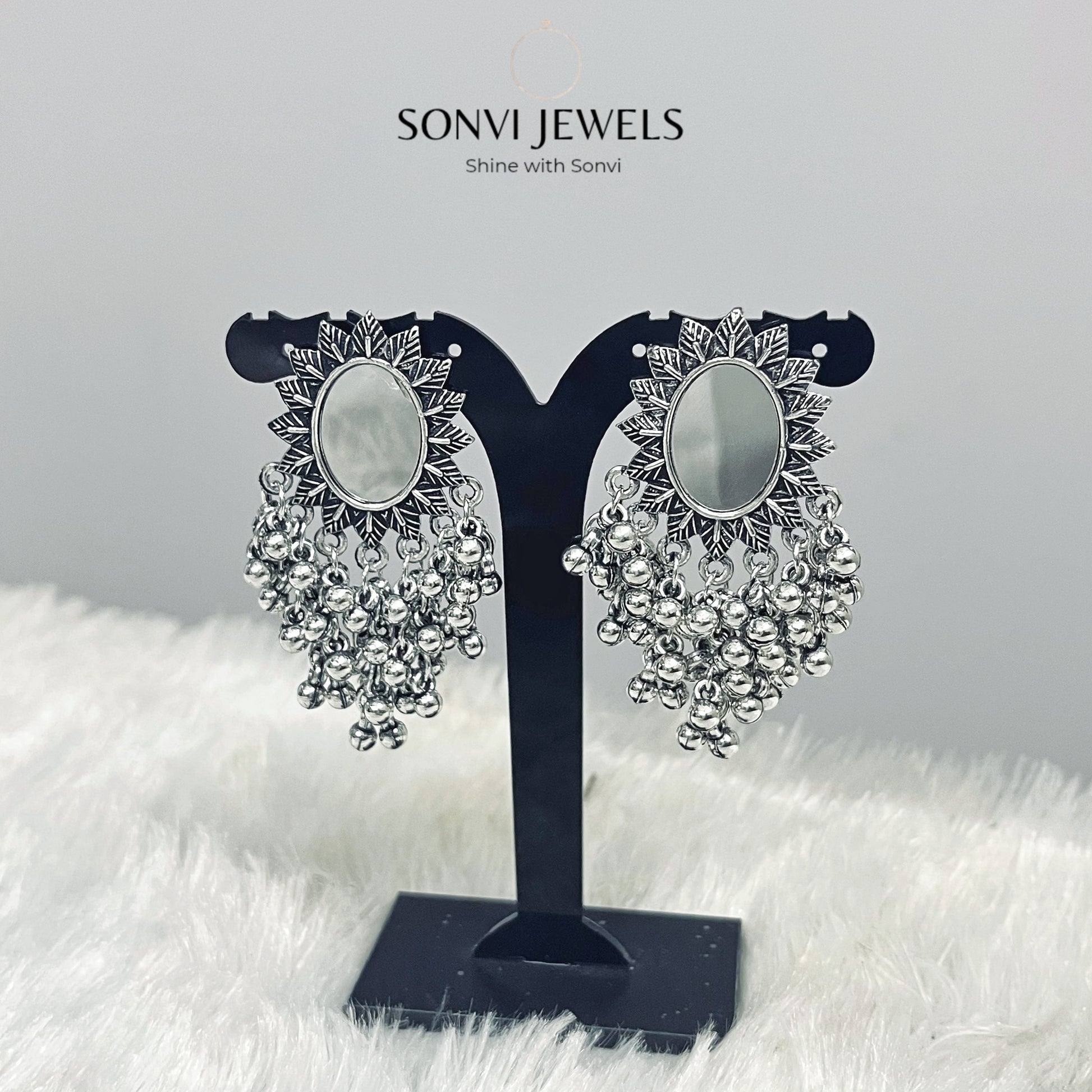 Inspired by celestial beauty, these oxidised sunburst mirror earrings are made to dazzle. The bold mirror center piece and silver ghungroo drops bring festive radiance to every look - perfect for pairing with sarees, lehengas, or Indo-western outfits